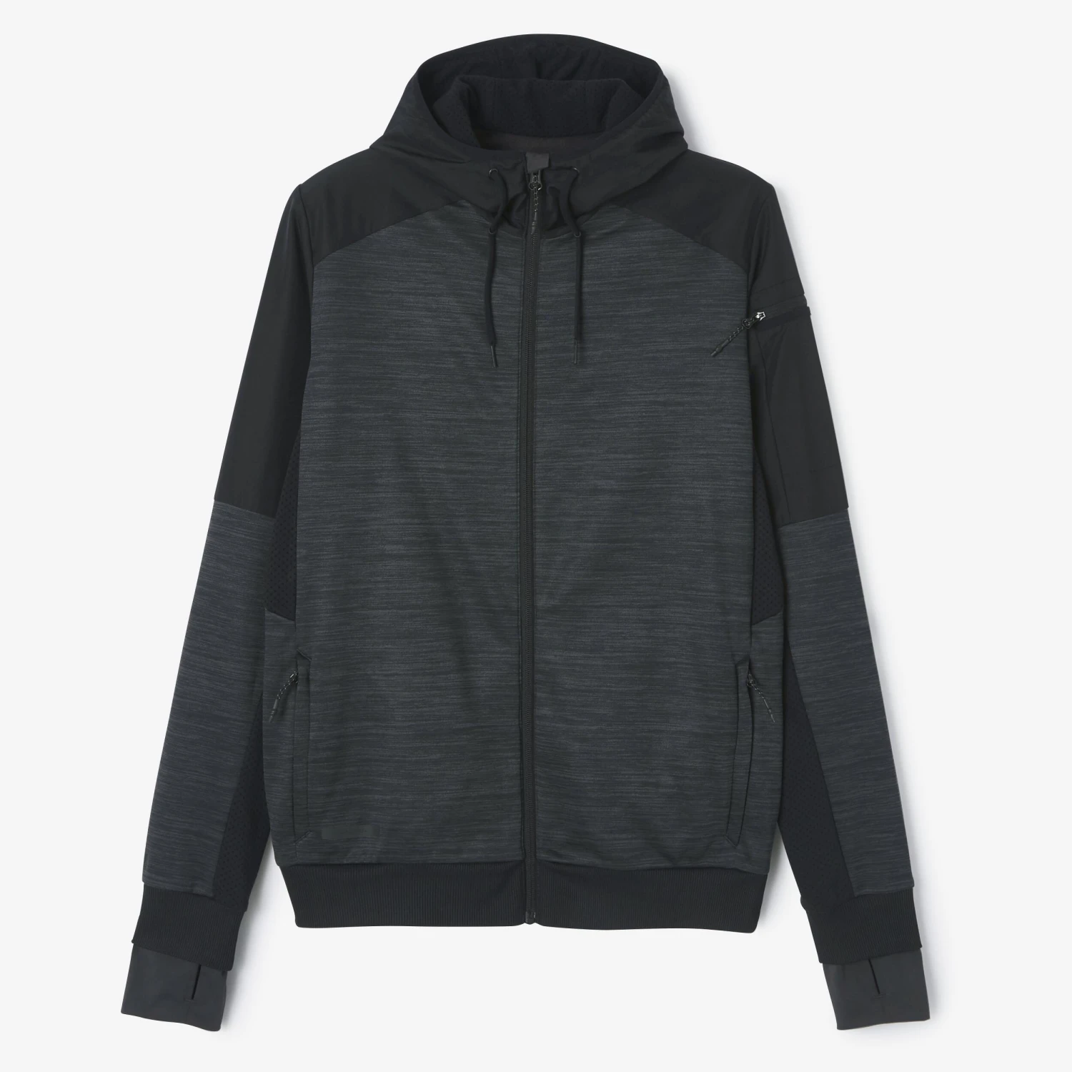 Our designers developed this warm and breathable men’s zipped hoodie sweatshirt for your running outings in cold weather.This men’s zipped hoodie sweatshirt is warm thanks to its fabric and breathable thanks to its different air vents. It is a staple for your running outings. Its arm pocket is for carrying your phone.